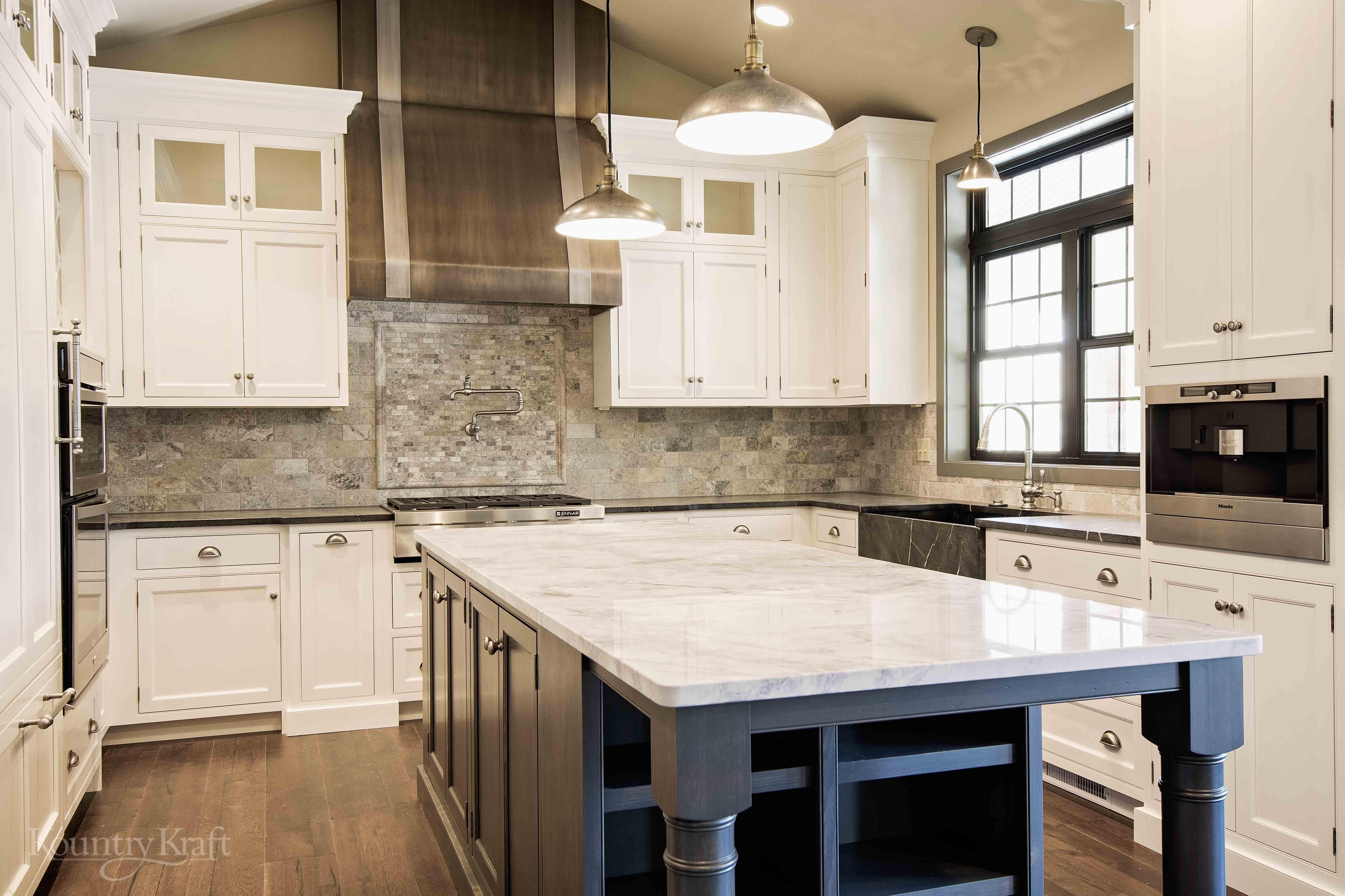 Cabinets, ceiling, and trim are painted white dove by benjamin moore.